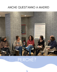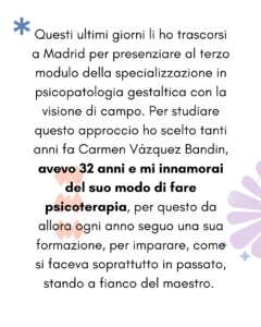Questi ultimi giorni li ho trascorsi a Madrid per presenziare al terzo modulo della specializzazione in psicopatologia gestaltica con la visione di campo. Per studiare questo approccio ho scelto tanti anni fa Carmen Vázquez Bandin, avevo 32 anni e mi innamorai del suo modo di fare psicoterapia, per questo da allora ogni anno seguo una sua formazione, per imparare, come si faceva soprattutto in passato, stando a fianco del maestro.