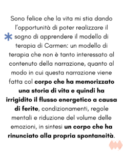 Sono felice che la vita mi stia dando l’opportunità di poter realizzare il sogno di apprendere il modello di terapia di Carmen: un modello di terapia che non è tanto interessato al contenuto della narrazione, quanto al modo in cui questa narrazione viene fatta col corpo che ha memorizzato una storia di vita e quindi ha irrigidito il flusso energetico a causa di ferite, condizionamenti, regole mentali e riduzione del volume delle emozioni, in sintesi un corpo che ha rinunciato alla propria spontaneità.