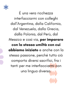 È una vera ricchezza interfacciarmi con colleghi dall’Argentina, dalla California, dal Venezuela, dalla Grecia, dalla Polonia, dal Perù, dal Messico e così via, per imparare con la stessa umiltà con cui abbiamo iniziato e anche con la stessa passione, perché tutto ciò comporta diversi sacrifici, fra i tanti per me interfacciarmi con una lingua diversa.